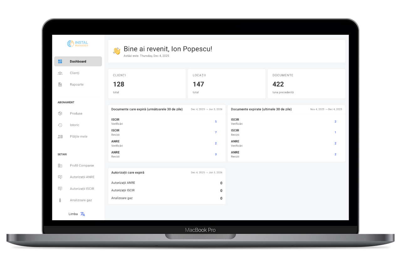 Începi gratuit pentru 3 luni (ISCIR + ANRE + 10 SMS/lună). După trial, alegi modulele dorite. Plata se reînnoiește automat lunar și o poți opri oricând din cont.